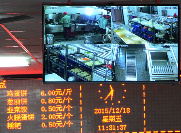 公管处王明会老师告诉记者:“学校领导高度重视学生的安全健康问题,我们安装这个系统,让更多的师生了解食堂卫生情况。此次在食堂一共安装了70个摄像头,通过电脑实时监控了解食堂的卫生情况和就餐情况。上半年,学校通过了《安徽省推进餐饮服务‘明厨亮灶’工程实施方案》,从4月24开始申请‘明厨亮灶’方案,在社会上公开招标。9月至11月份依次在学校6个食堂学生食堂与2个教师食堂安装‘明厨亮灶’这个系统,由以前的幕后少数人能看到,转为所有师生能看到。同学们通过这个系统,可以看到厨房的具体情况,也加强师生对学校食堂的信任。”
