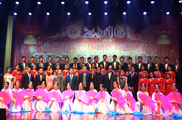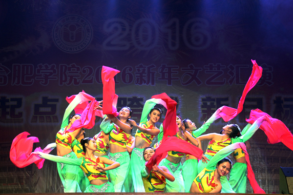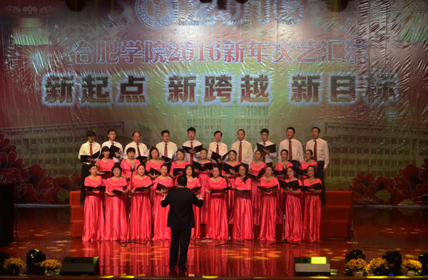 张文兵在开场致辞中总结了我校过去一年的不凡成绩,对学校来年的发展寄予深切期待,希望师生携手,创造更美好的明天。学校的教职工们深情地合唱歌曲《鼓浪屿之歌》和《共和国之恋》,婉转悠扬的歌曲寄托了对祖国河山的深沉爱恋。大学生艺术团舞步下演绎的《且吟春雨》,古典优雅,迅速点燃了全场的气氛。韩国留学生的《韩流风》用歌声与舞蹈表达了他们对学校的热爱,轻快活泼的旋律给观众带来了不一样的视觉与听觉的盛宴。教工舞蹈队的节目《茉莉花》在欢快的音乐声中上演,老师们撑着纸伞,踮着脚尖,一举手一投足,都带着娇俏可人的少女姿态,柔美绚丽的舞蹈让学生们见识到课堂之外的、属于老师们活泼青春的一面。看到中国老师的精彩表演,合肥学院的德国老师们也热情上台,在钢琴声中深情的朗诵诗篇《合肥颂》,虽然语言不同,但同所有人一样的对合肥学院的那份热爱感染了在场的观众。最终晚会在《远方的客人请你留下来》和《祝福祖国》的合唱中落下了帷幕。