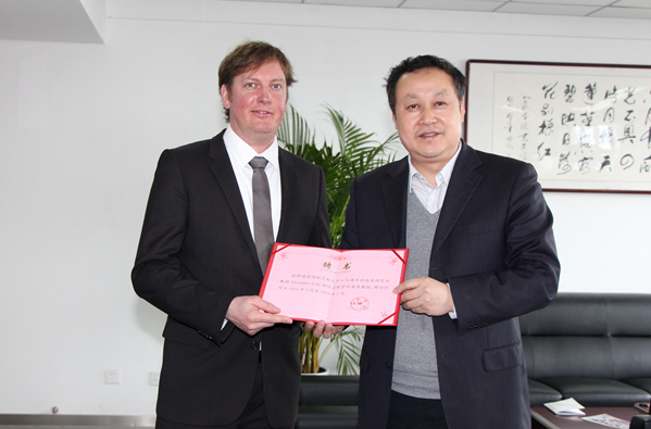 3月7日,党委书记蔡敬民教授在行政楼9楼东会议室会见了来我校进行访问的德国航空航天中心交通系统技术研究所Alexander Sohr教授和Xiaoxu Bei教授。蔡敬民为两位教授颁发了客座教授聘书。合肥学院科技处、计科系与安徽科力公司、Alexander Sohr教授、Xiaoxu Bei教授就在智能交通领域开展合作研究进行了实质性的洽谈,双方就研究任务、人员安排、研究设备和场地、合作培养硕士等达成了初步协议。