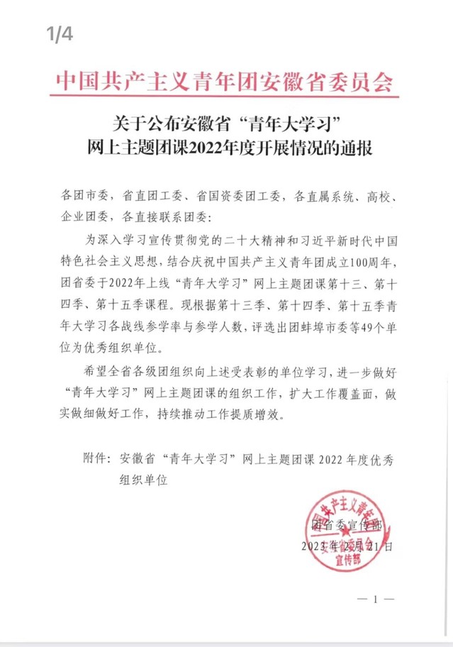 近日,团省委通报了安徽省“青年大学习”网上主题团课2022年度开展情况,我校团委获评2022年度优秀组织单位。