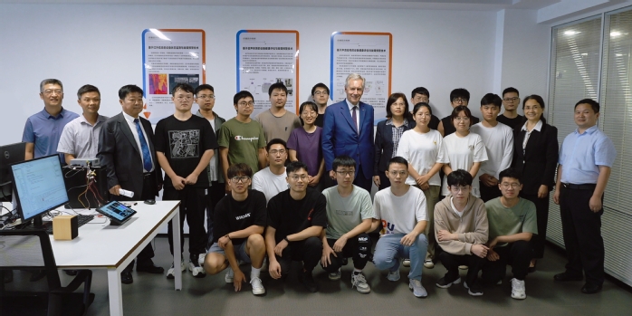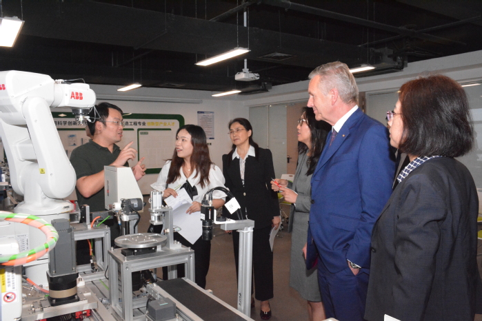武尔夫一行还参观了大众学院校企实训平台,在多模态设备健康评估实验室、智能制造系统集成技术应用及创新中心、数字孪生技术及工程应用中心调研了学科建设、模块化课程、实训教学等情况,高度肯定了我校“地方性、应用型、国际化”的办学定位。