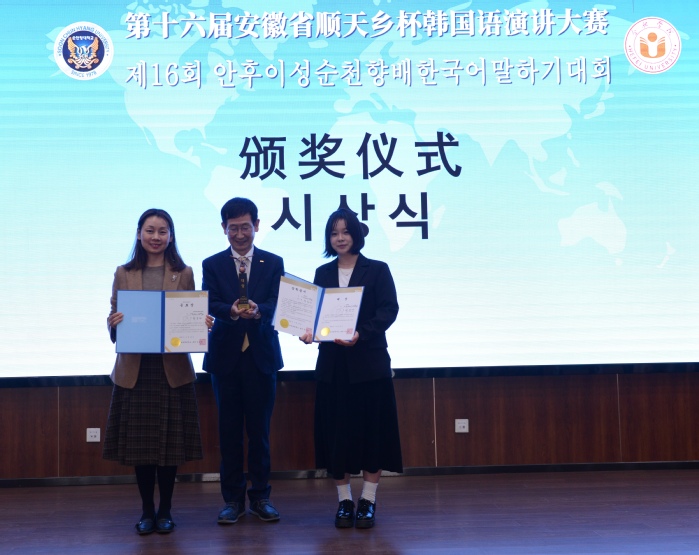 11月23日,安徽省第十六届顺天乡杯韩国语演讲比赛决赛在我校举行。我校5名参赛选手均获得优异成绩,其中21级朝鲜语专业石珊珊以出色的韩语水平和沉稳的发挥夺得比赛的桂冠。
