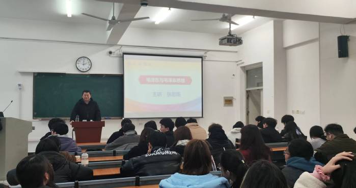 张思扬从“历史的回顾,早期的人生,伟大的思想,不朽的功勋”四个方面,带领同学们系统回顾毛泽东同志的一生,重温中国共产党人的初心和使命。课上,张思扬介绍了毛泽东同志的人生历程和毛泽东思想诞生的历史意义,使同学们真正解了毛泽东思想是马克思列宁主义基本原理和中国革命和建设具体实际相结合的产物,是中国共产党人集体智慧的结晶。同时他围绕“第一代共产党人如何坚守初心”与同学们进行了深入探讨,勉励同学们要牢记“为中国人民谋幸福,为中华民族谋复兴”的初心,认真学习,掌握过硬的知识本领,在新时代努力为实现中华民族的伟大复兴而奋斗。