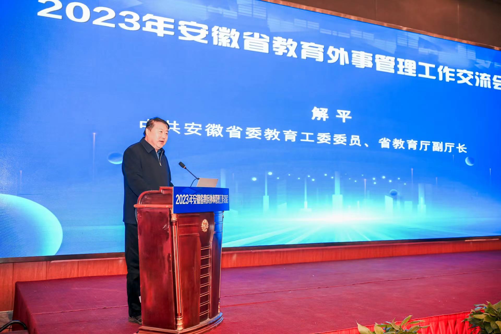 解平总结了近年来我省教育外事工作开拓创新和服务大局等方面取得的成绩和亮点,分析了当前形势和发展堵点,希望下一步全省教育外事领域切实提高思想认识,主动作为,服务国家总体外交大局,统筹好发展与安全,贯彻落实总体国家安全观,加强业务培训,强化教育外事工作队伍建设,在教育部和省委省政府的关心和领导下,加快和扩大教育对外开放,不断开创安徽教育外事工作新局面。