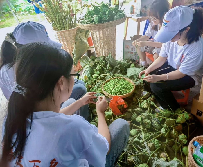 76日,“城韵建谐,暑梦新坊”实践团队前往丰乐镇蒋岗村万亩荷塘基地,与当地农户一起体验了莲子手工制作方法,下莲塘、摘莲蓬、剥莲子,了解养殖荷花的销售渠道与经销方式。团队成员结合实际情况给万亩荷花池乌篷船水渠改造和文化展馆建设提供设计方案,并表示可以搭建相关销售平台帮助宣传和推广荷花系列产品,用电商平台赋能乡村振兴高质量发展。