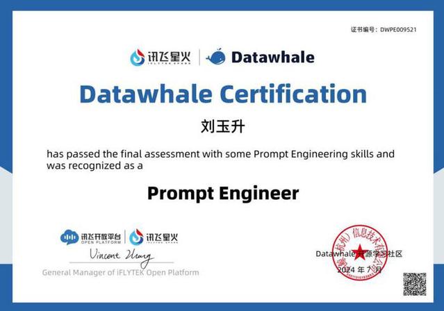 2024年6月至9月,在导师推荐下,刘玉升通过选拔进入科大讯飞股份有限公司讯飞数码研究院实习,深度参与了讯飞星火大模型的研发工作,主要负责Prompt工程优化任务。凭借扎实的专业基础和出色的工程能力,他系统性地完成了各类任务的整编工作,通过深入分析客户需求,制定了差异化的Prompt优化策略。在数据处理层面,他运用Python对训练数据进行清洗与统计分析,成功构建了包含10万余条的高质量SFT数据,覆盖33个具体任务场景。此外,他还参与了大模型效果的评测工作,为后续模型的迭代优化提供了支持。