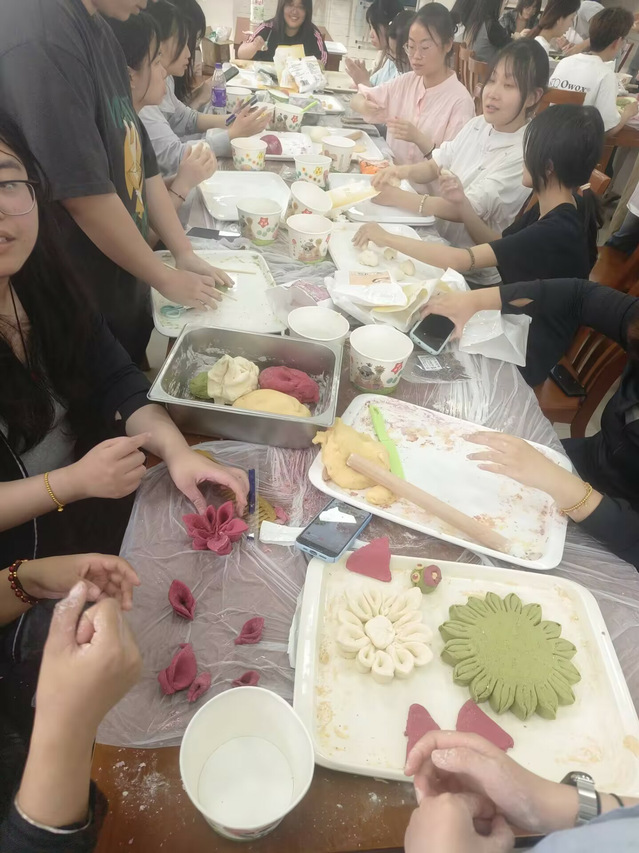 同学们分组行动,各显身手,食堂内一片热火朝天的景象,各小组分工明确,有人揉面,有人塑形,有人装饰。面粉在指尖翻飞,不一会儿,憨态可掬的小猪、灵动的蝴蝶、盛开的花朵等造型各异的花馍便纷纷成型。大家互相交流经验,分享创意,欢声笑语回荡在食堂中。