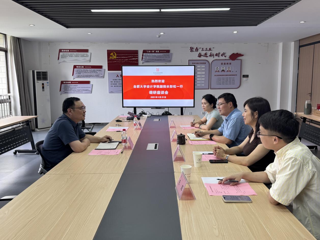 6月25日下午,设计学院副院长彭松一行前往安徽工业大学艺术与设计学院就校企合作、产学研工作进行交流。安徽工业大学艺术与设计学院院长肖旺群、视觉艺术设计系主任佘慧莉、副主任张煜鑫、工业设计系副主任朱旺到场参加。