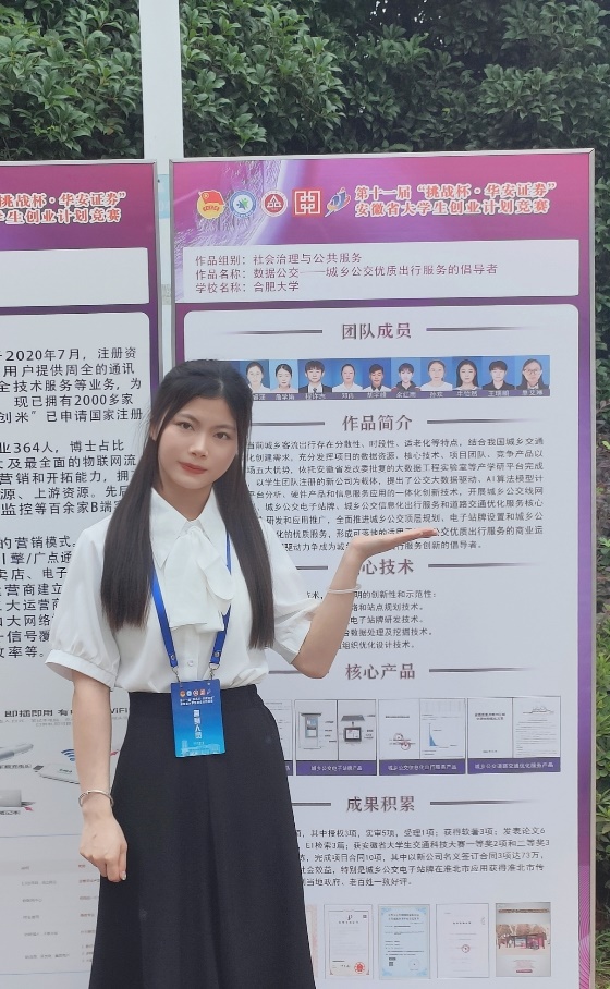 创新无止境,每一次创新都是一次挑战和机遇。研究生在读期间,李雨琪作为主要完成人参加第八届安徽省互联网+”创新创业大赛并荣获金奖,第十届挑战杯安徽省大学生课外学术科技作品竞赛并荣获二等奖,作为团队负责人以《数据公交--城乡公交优质出行服务的倡导者》为题参加第十一届挑战杯安徽省大学生创业计划竞赛并荣获银奖。随后,她凭借竞赛优异表现被校团委推荐参加第十四届创青春安徽青年创新创业大赛并荣获省级铜奖,同时被校团委重点报道。最后她又带领团队成员参加2024年安徽省大学生创新大赛,期间每天往返于实验室和校创新创业大楼之间,最终完成了300多页的比赛计划书和37页的PPT,获得了省级金奖,并以学校第一排名晋级国赛。研二期间,她将一半的时间投入到学科竞赛中,这不仅为她赢得了诸多荣誉,更重要的是全面提升了她的个人综合能力,彰显了新时代青年的奋斗与担当。