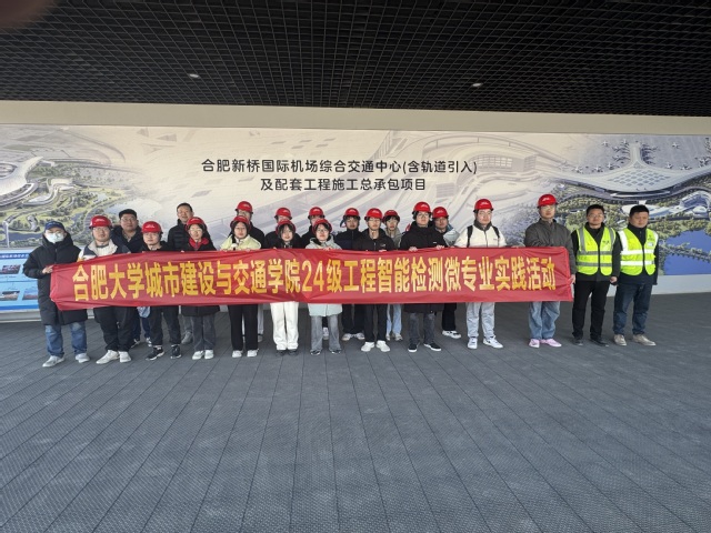 为强化学生专业认知,链接行业发展前沿,帮助学生做好职业生涯规划,巩固校企合作,将专业理论与生产实际相结合,城市建设与交通学院“工程智能检测”微专业于2025年1月9日-10日开展校外实践教学活动。城交学院微专业教学团队杨睿、钱宇翔老师带队参加本次实践活动,先后带领全体学生参观合肥新桥国际机场综合交通中心(含轨道引入)及配套工程施工总承包项目、临泉县城乡供水一体化(群众喝上引调水工程)原水官网安全监测项目以及大连西路地下综合管廊项目。