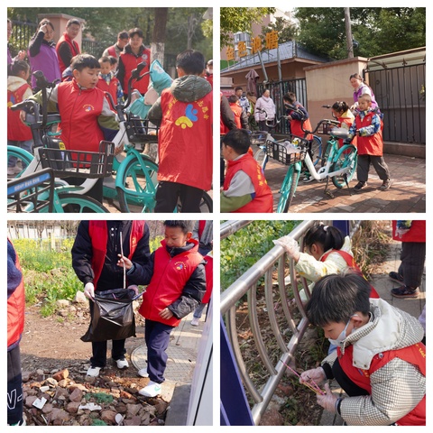 活动当日,志愿者们前往合肥市金湖社区,与合肥市金湖小学一(1)班的小学生们深入社区与植物园周边绿地,重点清理绿化带垃圾,并向当地居民普及垃圾分类知识,引导公众参与环保行动;他们还在道路旁的共享单车停放区开展秩序维护,扶正倒伏车辆80余辆,劝导路人规范停车。活动中,志愿者们带领小学生共同劳动,通过“大手牵小手”的协作模式,将环保理念传递给下一代,让他们在实践中感悟奉献精神。