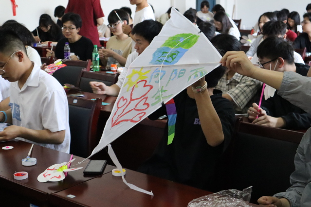 下午2:30,活动正式开始。同学们三人一组用事先准备好的纸、笔、颜料等工具开始制作风筝。同学们大胆想象,尽情地发挥自己的聪明才智,把风筝画成自己喜欢的样子,制作好的风筝可现场放飞,感受童年时的乐趣,放松身心。