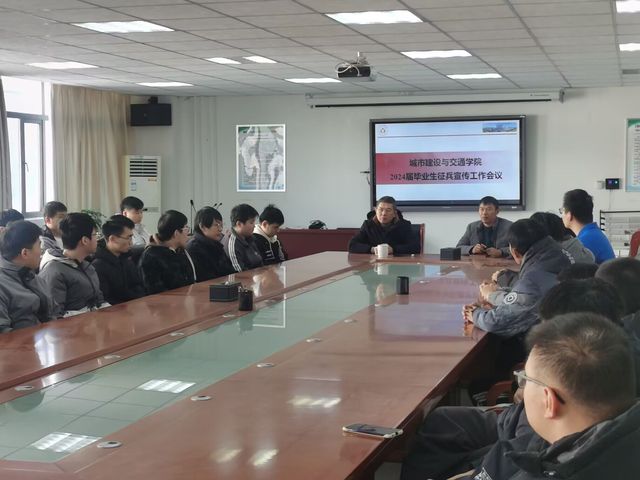 2023121日中午在413楼大会议室,城建学院召开2024届毕业生征兵宣传工作会议,城建学院党委书记张永军、毕业班辅导员以及毕业班的本科生、研究生参加了会议。张书记在会上把最新的大学生征兵政策向同学们作了详细的解读。