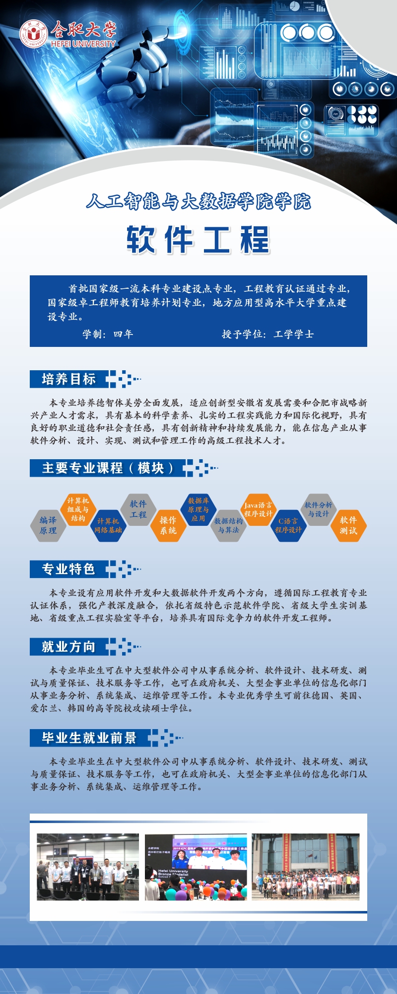 毕业生发展方向:毕业生可在中大型软件公司中从事系统分析、软件设计、技术研发、测试与质量保证、技术服务及项目管理等工作;也可在政府机关、企事业单位的信息化部门从事业务分析、系统集成、运维管理等工作也可继续攻读硕士学位研究生或出国深造。