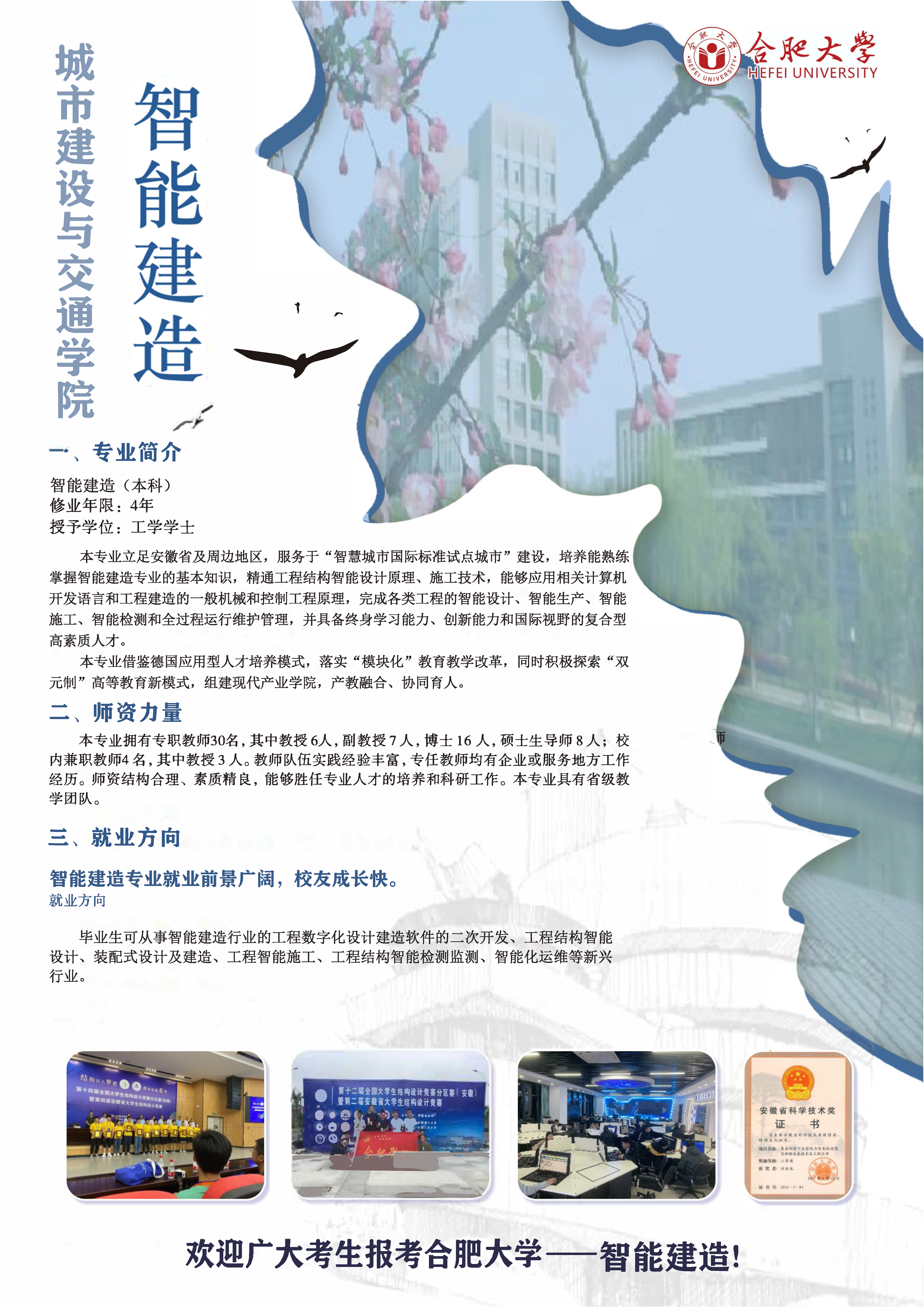培养目标及特色:本专业立足安徽省及周边地区,服务于“智慧城市国际标准试点城市”建设,培养能熟练掌握智能建造专业的基本知识,精通工程结构智能设计原理、施工技术,能够应用相关计算机开发语言和工程建造的一般机械和控制工程原理,完成各类工程的智能设计、智能生产、智能施工、智能检测和全过程运行维护管理,并具备终身学习能力、创新能力和国际视野的复合型高素质人才。本专业借鉴德国应用型人才培养模式,落实“模块化”教育教学改革,同时积极探索“双元制”高等教育新模式,组建现代产业学院,产教融合、协同育人。