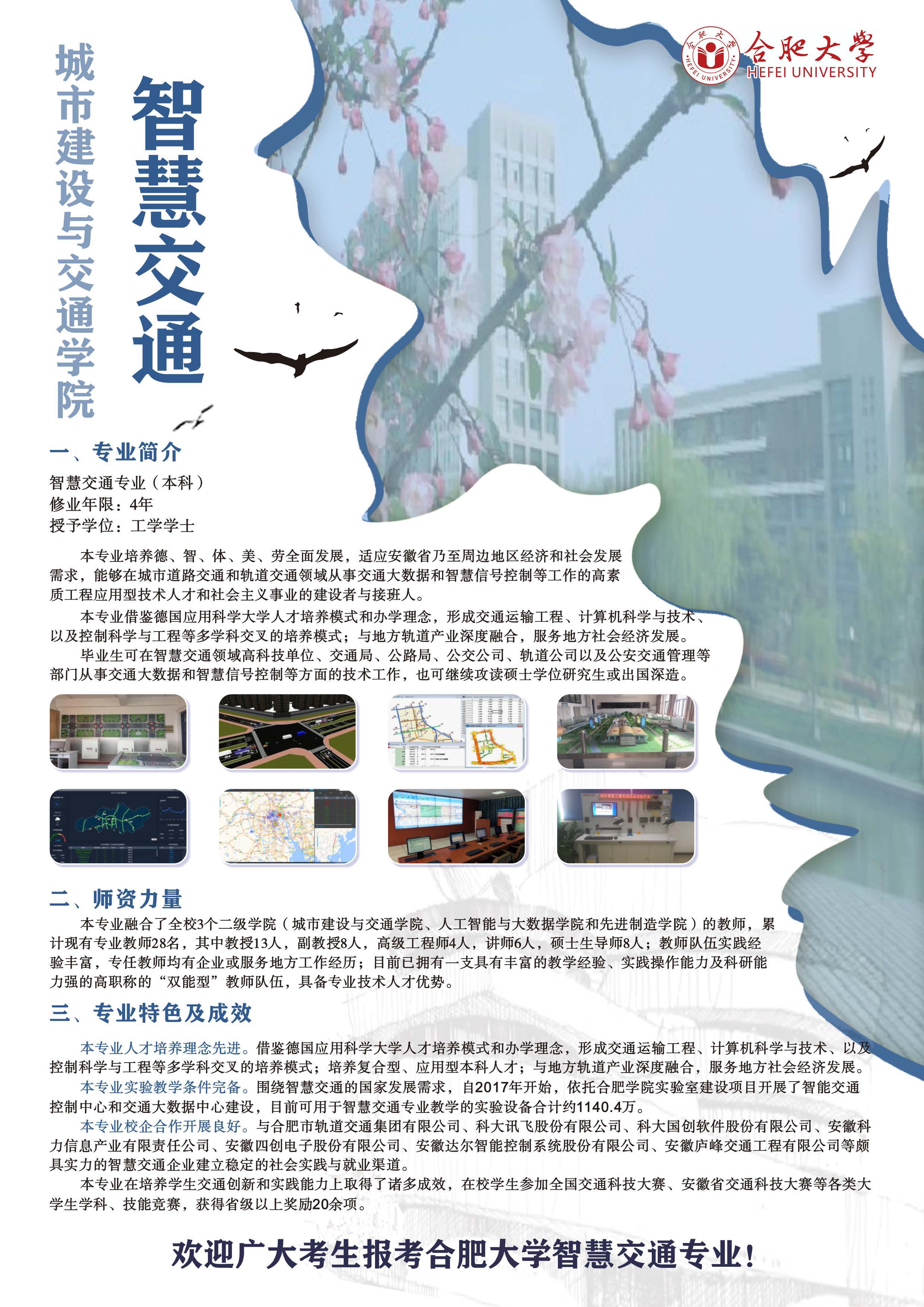 培养目标及特色:本专业培养德、智、体、美、劳全面发展,适应安徽省乃至周边地区经济和社会发展需求,能够在城市道路交通和轨道交通领域从事交通大数据和智慧信号控制等工作的高素质工程应用型技术人才和社会主义事业的建设者与接班人。本专业借鉴德国应用科学大学人才培养模式和办学理念,形成交通运输工程、计算机科学与技术、以及控制科学与工程等多学科交叉的培养模式;与地方轨道产业深度融合,服务地方社会经济发展。