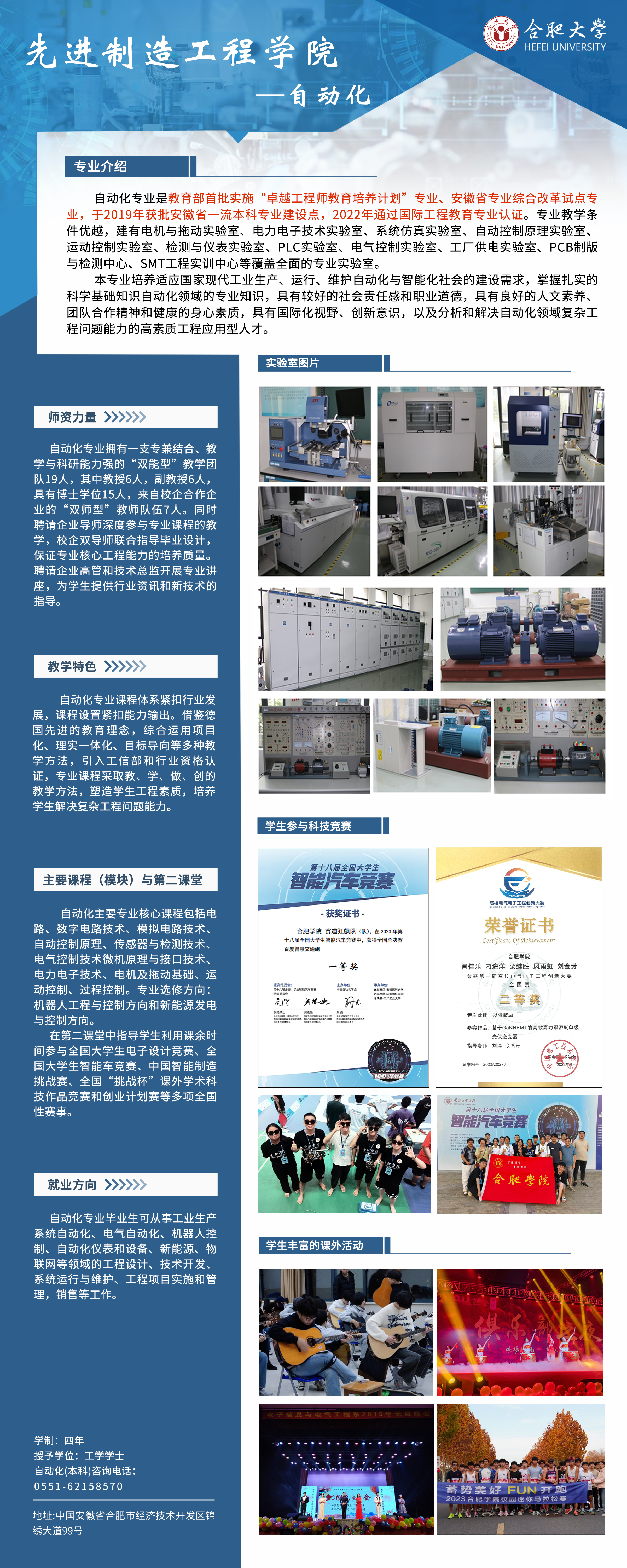 培养目标及特色:本专业培养培养德、智、体、美、劳全面发展,适应国家现代工业制造自动化的建设需求,掌握扎实的科学基础知识、自动化领域的专业知识,具有团队合作精神和健康的身心素质,视野、创新意识,以及分析和解决通信工程领域复杂工程问题能力的应用型专门人才。学生毕业5年后,可在工业企业、科研院所等单位从事运动控制、过程控制、制造系统自动化、电气自动化技术、机器人控制、自动化仪表和设备、智能监控系统、物联网等方面的工程设计、技术开发、系统运行与维护、工程项目实施和管理等工作;也可成为应用型工程师,承担技术及管理骨干的角色,带领团队在工程实践中取得创造性成就。
